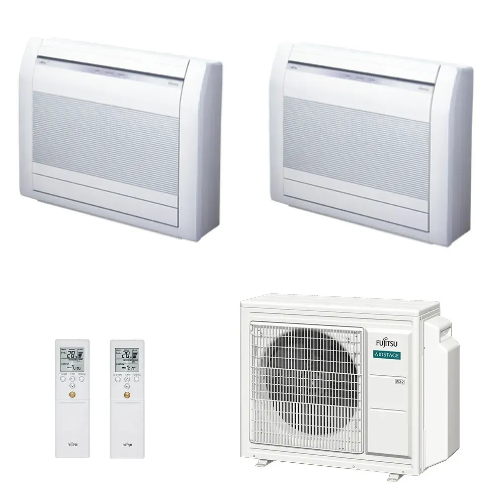 Klimaanlagen Fujitsu Duo Split Serie Fußboden KV WiFi Optional 15000+15000 Btu Heizung mit Wärmepumpe mit Niedrigenergieverbrauch Invertertechnologie ideal für Dachböden oder Installationen unter Fenstern, optimal zum Heizen durch die Position in Bodennähe