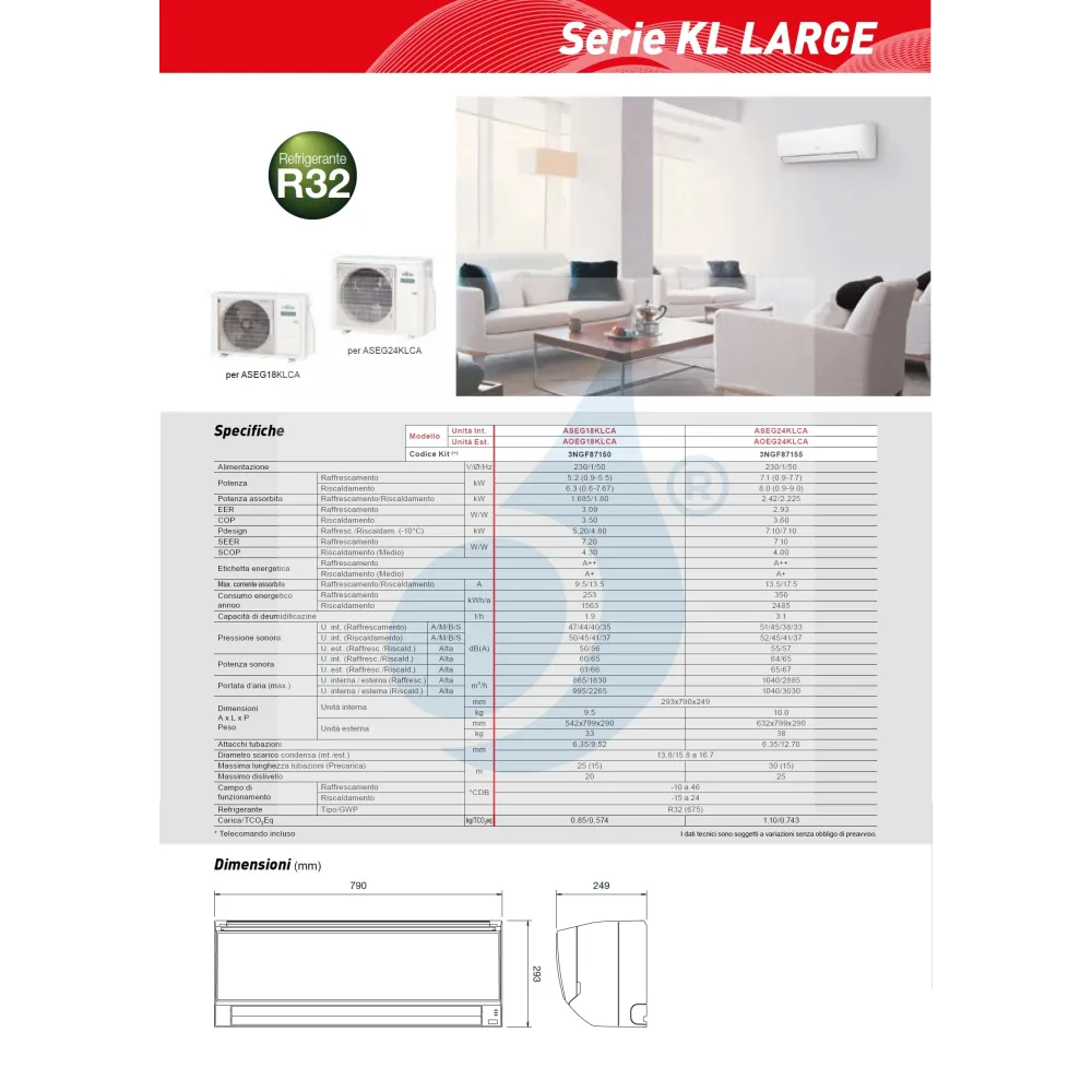Klimaanlagen Fujitsu Mono Split Serie KL 18-24 WiFi Optional 18000 Btu Heizung mit Wärmepumpe mit Niedrigenergieverbrauch Invertertechnologie