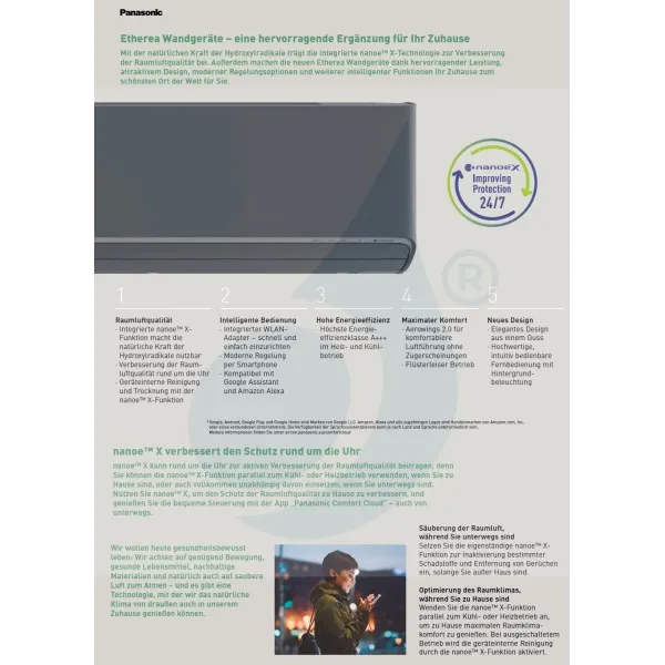 Mit der Etherea-Serie wird ein neues Nanoe X-Filtrations- und Reinigungssystem eingeführt, das mithilfe der Nanotechnologie 99% der in der Luft befindlichen oder klebenden Verunreinigungen wie Bakterien, Viren und Schimmelpilze entfernt und neutralisiert. Ideal für diejenigen, die in der Nähe von belebten Bereichen, Produktionsbereichen oder einfach für diejenigen leben, die auf die Qualität der Luft achten, die sie atmen!Zusätzlich gibt es die Mild Dry Cooling-Funktion, die ein schnelles Absenken der Umgebungsfeuchtigkeit verhindert.