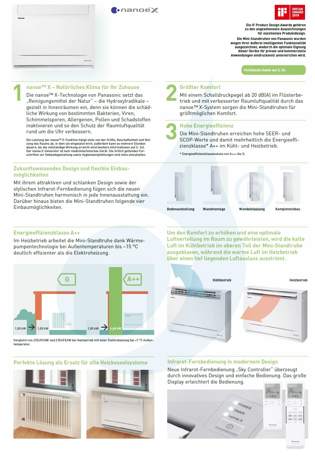 Bodenkonsole mit dem neuen Luftreinigungssystem nanoe X: Hocheffizientes A ++, Komfort (Supersilent Technology nur 20 dB (A)) bei der Kühlung und gesunde Luft in Verbindung mit modernstem Design.Der doppelte klimatisierte Luftauslass (nach oben für kalte Luft und nach unten für heiße Luft) verbessert den Komfort und macht die Umgebungstemperatur gleichmäßiger.
