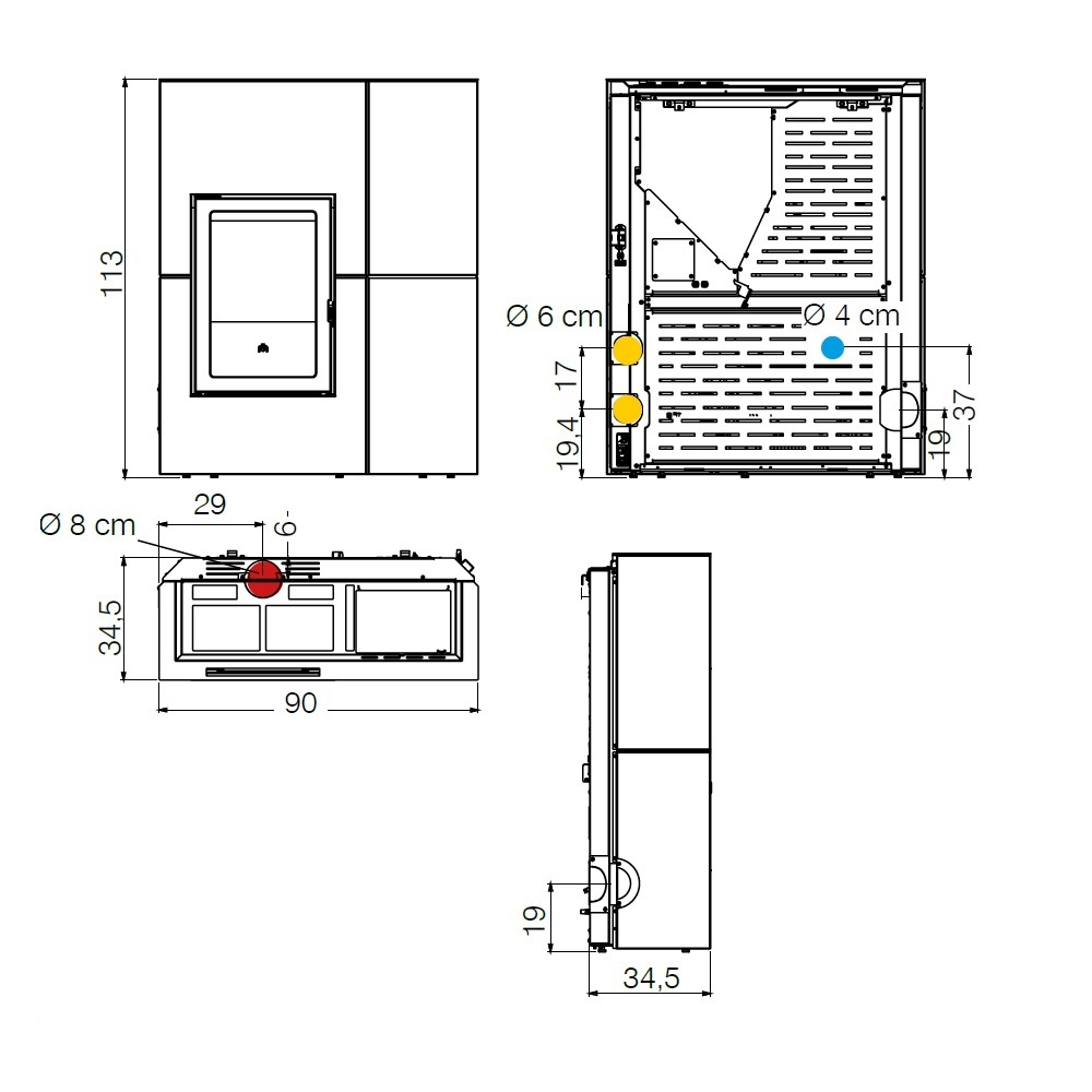 - Durchmesser des Rauchrohrs: 8 cm