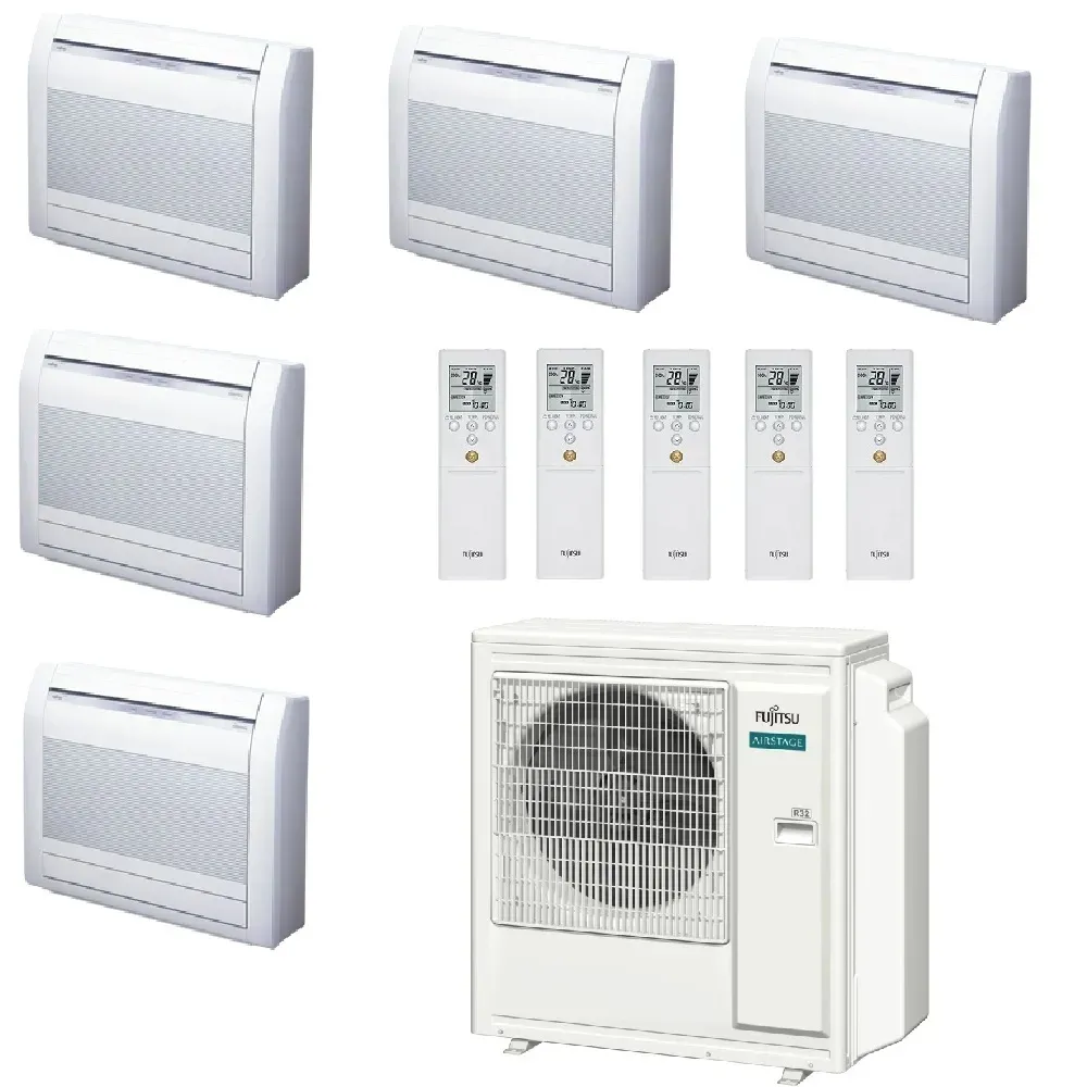 Klimaanlagen Fujitsu Penta Split Serie Fußboden KV WiFi Optional 9+9+9+9+12 Btu Heizung mit Wärmepumpe mit Niedrigenergieverbrauch Invertertechnologie ideal für Dachböden oder Installationen unter Fenstern, optimal zum Heizen durch die Position in Bodennähe