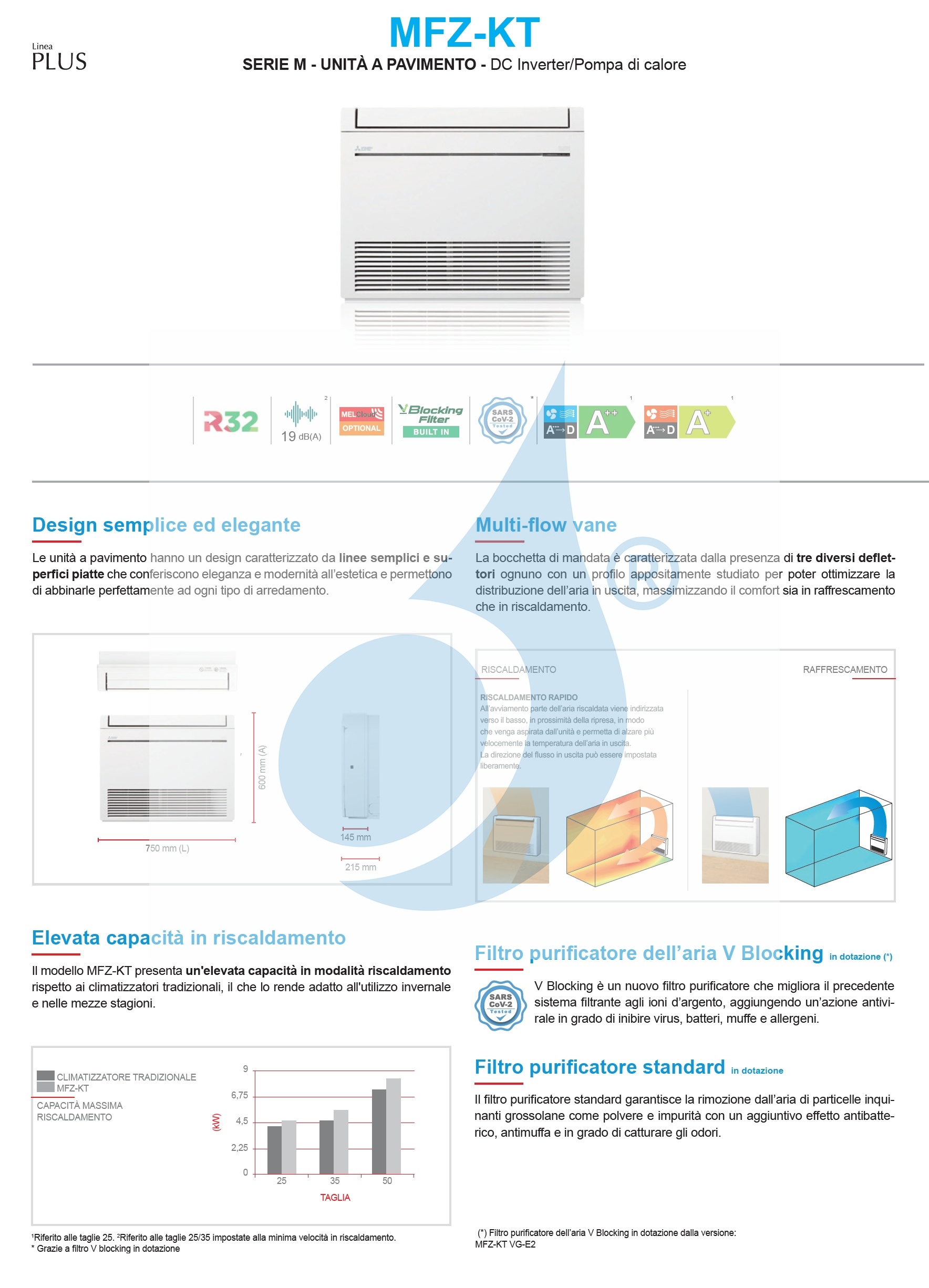 Klimaanlagen Mitsubishi Penta Split Serie MFZ-KT WiFi Optional 9+9+9+9+12 Btu Inneneinheit für Mitsubishi-Klimaanlagen Mono Split- und Multi Split-Konfiguration mit Heiz- und Kühlmodus. Das Truhengerät MFZ-KT ist besonders für Anwendungen geeignet, in denen sowohl der Kühl- als auch der Heizbetrieb regelmäßig zum Einsatz kommt. Wie ein Heizkörper in Bodennähe aufstellbar.