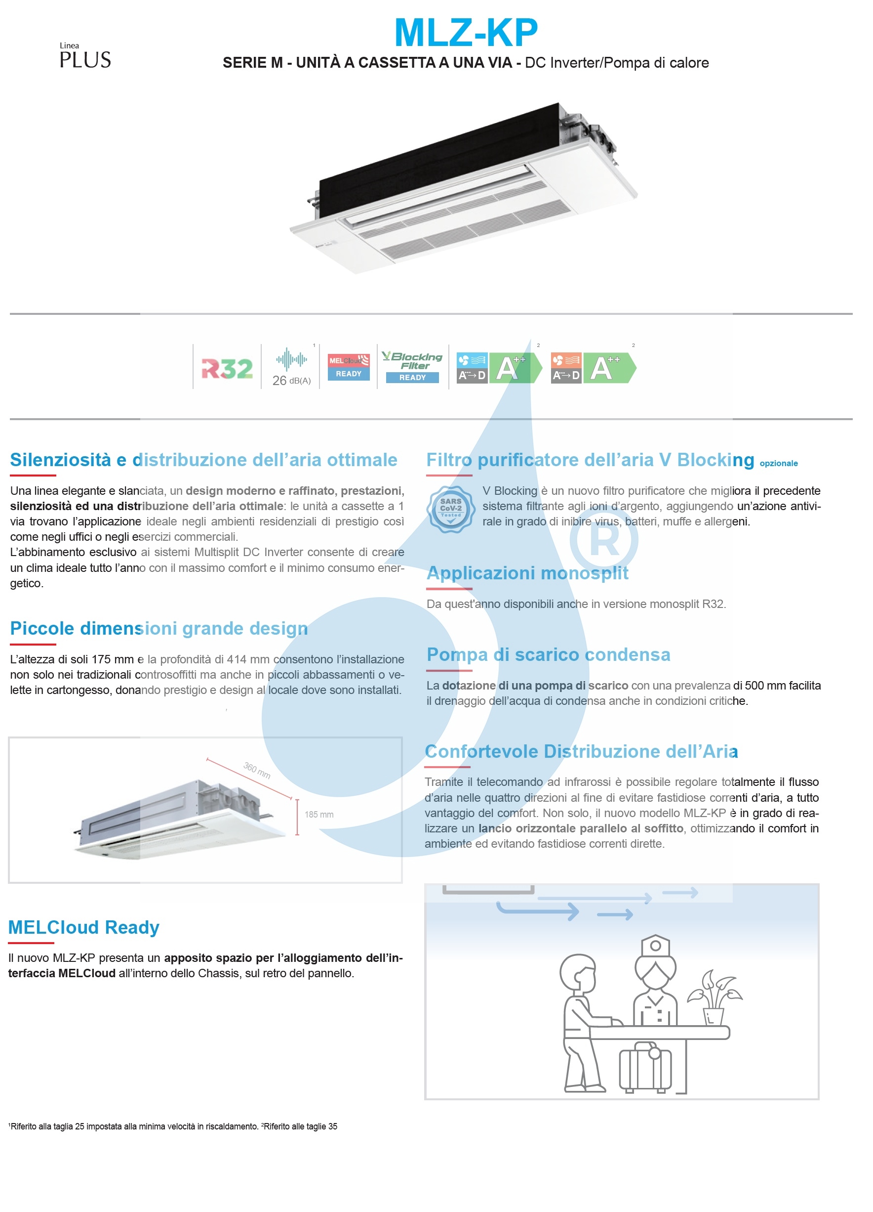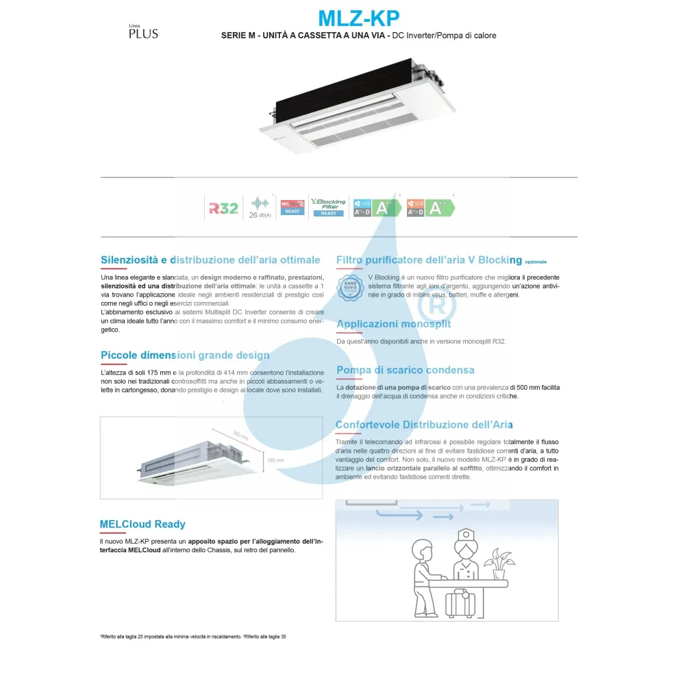 Klimaanlagen Mitsubishi Trio Split Serie MLZ-KP WiFi Optional 9000+12000+12000 Btu Inneneinheit für Mitsubishi-Klimaanlagen Mono Split- und Multi Split-Konfiguration mit Heiz- und Kühlmodus. Kassetten-Klimagerät MLZ-KP mit 1 Ausgang, hervorragend geeignet für eine Direktströmung oder kleine und beengte Räume.