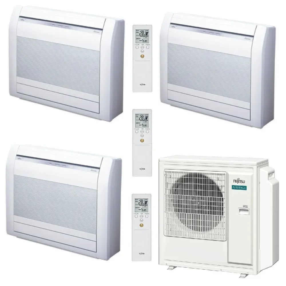 Klimaanlagen Fujitsu Trio Split Serie Fußboden KV WiFi Optional 12000+12000+15000 Btu Heizung mit Wärmepumpe mit Niedrigenergieverbrauch Invertertechnologie ideal für Dachböden oder Installationen unter Fenstern, optimal zum Heizen durch die Position in Bodennähe